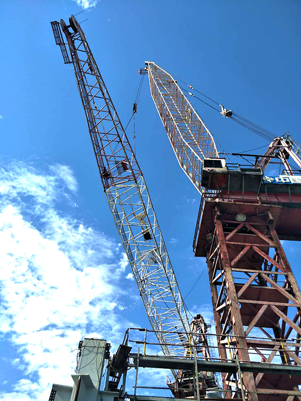 由于該項目309米主塔樓采用“鋼管混凝土框架+核心筒+伸臂桁架”的特殊建筑結構,傳統(tǒng)塔吊無法滿足施工作業(yè)要求。對此,項目引入了兩臺內(nèi)爬式動臂塔吊,安裝重量均為300噸左右,最后拆除完成的M900D動臂塔吊是目前中交集團房建領域應用的最大動臂塔吊,標準節(jié)總高度56米,吊臂長度45米,最大起重量64噸。