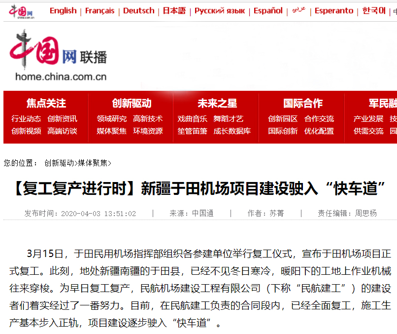 4月3日,中國(guó)網(wǎng)·中國(guó)通《復(fù)工復(fù)產(chǎn)進(jìn)行時(shí)》欄目,以“新疆于田機(jī)場(chǎng)項(xiàng)目建設(shè)駛?cè)搿燔嚨馈睘轭},對(duì)公司第九總經(jīng)理部承建的新疆于田民用機(jī)場(chǎng)工程場(chǎng)道及附屬設(shè)施工程三標(biāo)段復(fù)工復(fù)產(chǎn)情況進(jìn)行了專題報(bào)道。