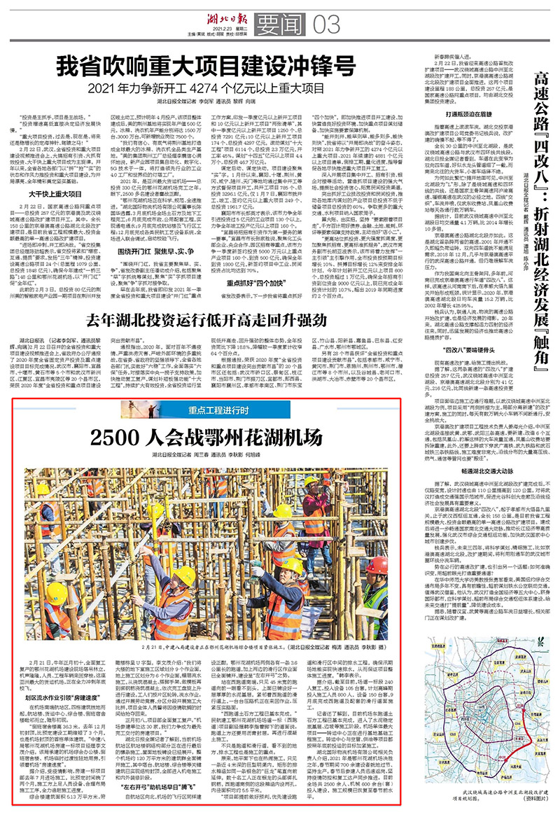 2月23日,《湖北日報(bào)》第25874期三版“重點(diǎn)工程進(jìn)行時”以《2500人會戰(zhàn)鄂州花湖機(jī)場》為題,對第十一總經(jīng)理部承建的鄂州花湖機(jī)場場道一標(biāo)段項(xiàng)目“左右開弓”助機(jī)場早日“騰飛”的建設(shè)事跡進(jìn)行報(bào)道。此外,央廣網(wǎng)、中新網(wǎng)、東楚網(wǎng)等媒體對此也進(jìn)行了轉(zhuǎn)載報(bào)道。