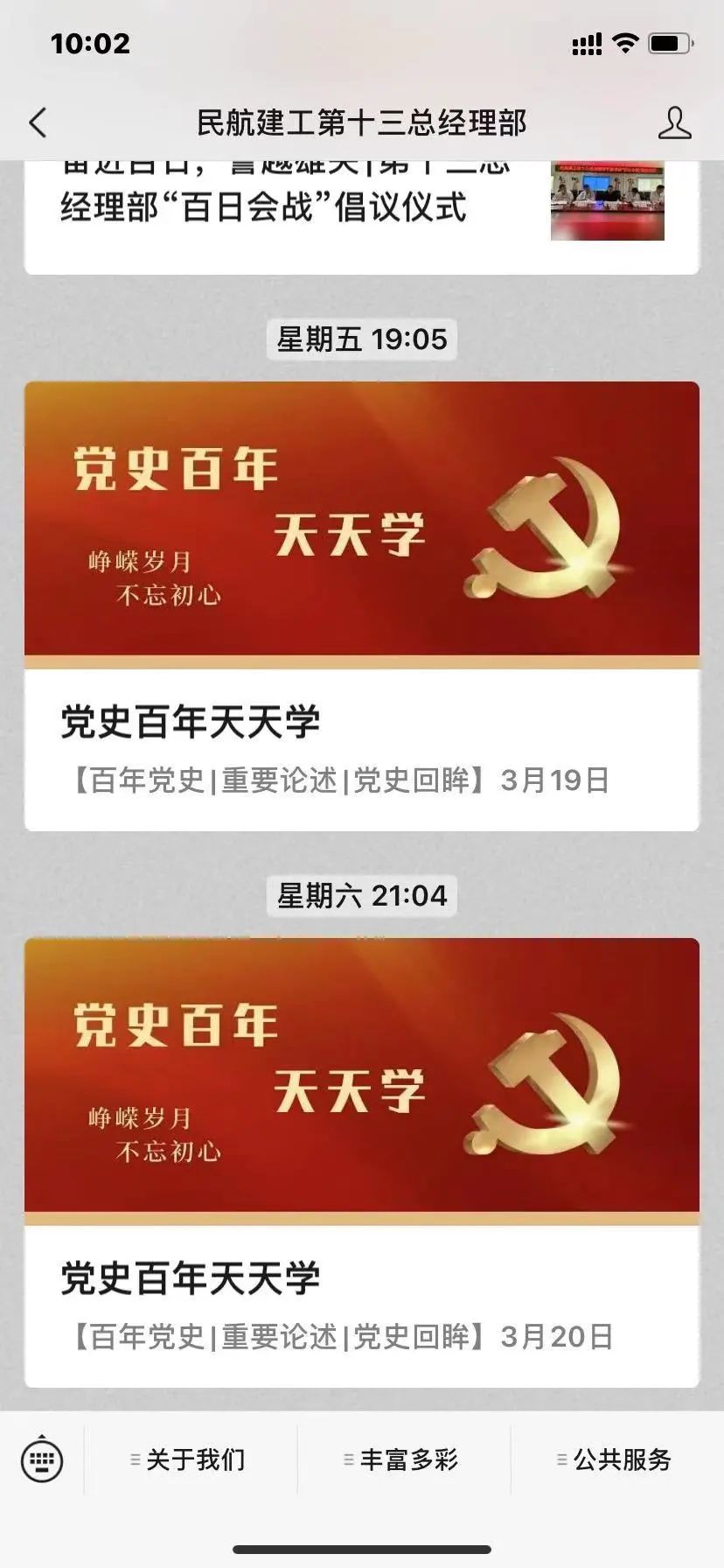 公司各基層單位通過開展形式多樣的宣貫活動,認真?zhèn)鬟_落實公司黨史學(xué)習(xí)教育動員部署會精神,第二總經(jīng)理部黨員代表在總經(jīng)理部黨史學(xué)習(xí)教育動員部署會上宣讀《學(xué)黨史 守初心 奮進新時代,為建黨100周年貢獻力量》倡議書。積極運用微信、微博、學(xué)習(xí)強國、官網(wǎng)等企業(yè)自媒體矩陣,在公司及所屬各單位微信開設(shè)“我是黨員我?guī)ь^”“學(xué)黨史、慶百年”“黨史白年天天學(xué)”等專欄,定期編發(fā)黨史學(xué)習(xí)教育工作相關(guān)題材的圖文和視頻,多措并舉營造濃厚學(xué)習(xí)氛圍。