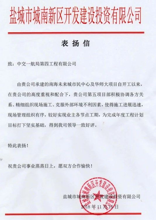 表揚(yáng)信指出,自開工以來,項(xiàng)目積極協(xié)調(diào)各方關(guān)系,克服諸多不利因素,精細(xì)組織施工,為完成年度工程計劃目標(biāo)打下堅(jiān)實(shí)基礎(chǔ),給予了充分的肯定和高度的贊揚(yáng),并衷心祝愿在今后的工作中雙方合作愉快。