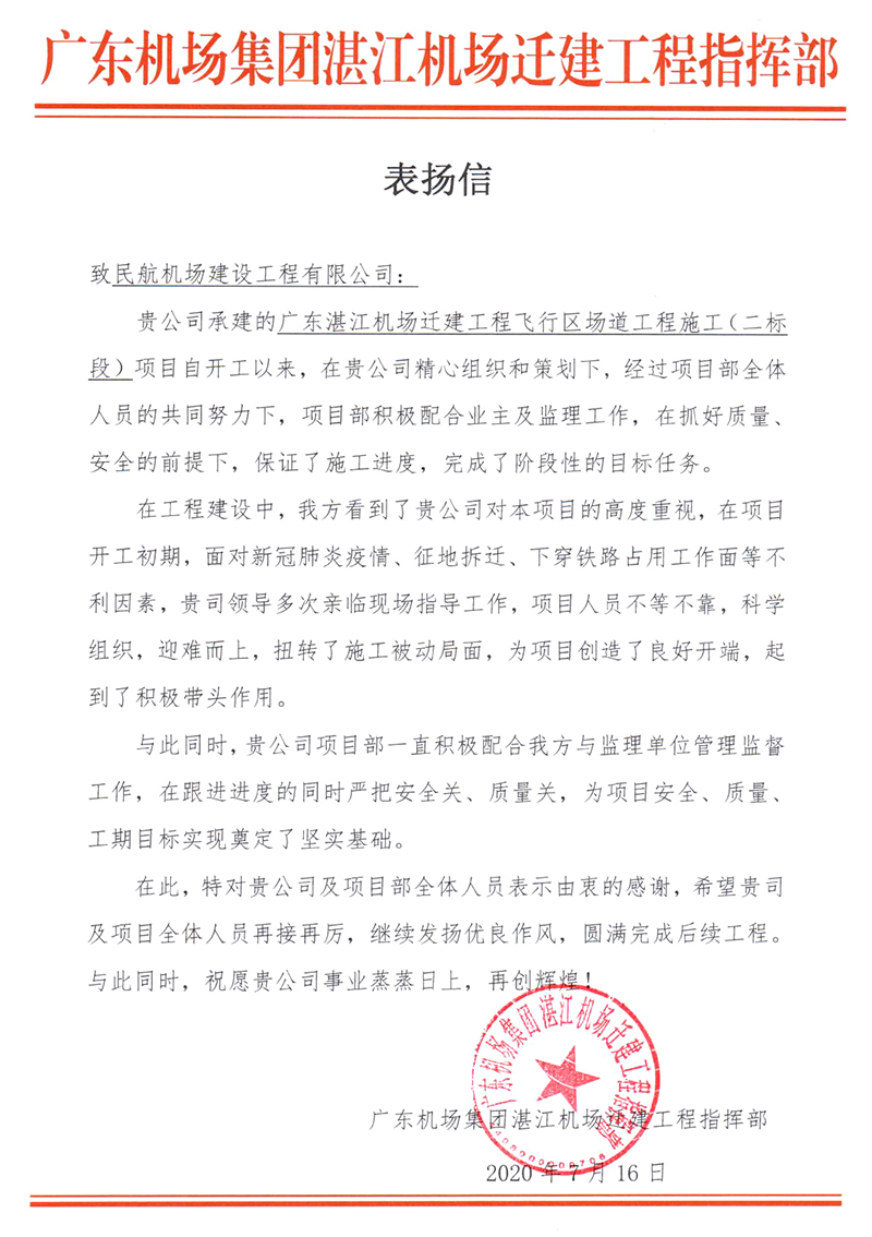 7月16日,第十六總經(jīng)理部承建的廣東湛江機場遷建工程飛行區(qū)場道工程施工(二標段)項目,收到來自廣東機場集團湛江機場遷建工程指揮部發(fā)來的表揚信。