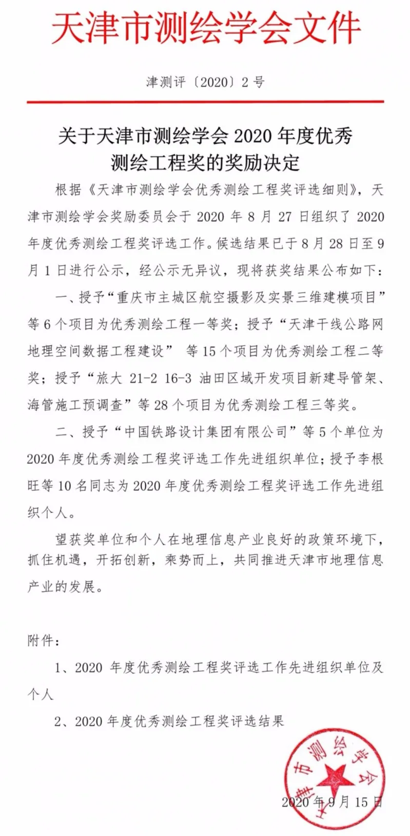 據(jù)悉,該獎(jiǎng)項(xiàng)是天津市測(cè)繪學(xué)會(huì)獎(jiǎng)勵(lì)委員會(huì)根據(jù)《天津市測(cè)繪學(xué)會(huì)測(cè)繪工程獎(jiǎng)評(píng)選細(xì)則》評(píng)選,旨在提高天津市廣大測(cè)繪工作者的積極性和創(chuàng)造性,促進(jìn)行業(yè)技術(shù)創(chuàng)新,提升工程質(zhì)量與效益,對(duì)天津市測(cè)繪事業(yè)健康向上發(fā)展起到重要推動(dòng)作用。