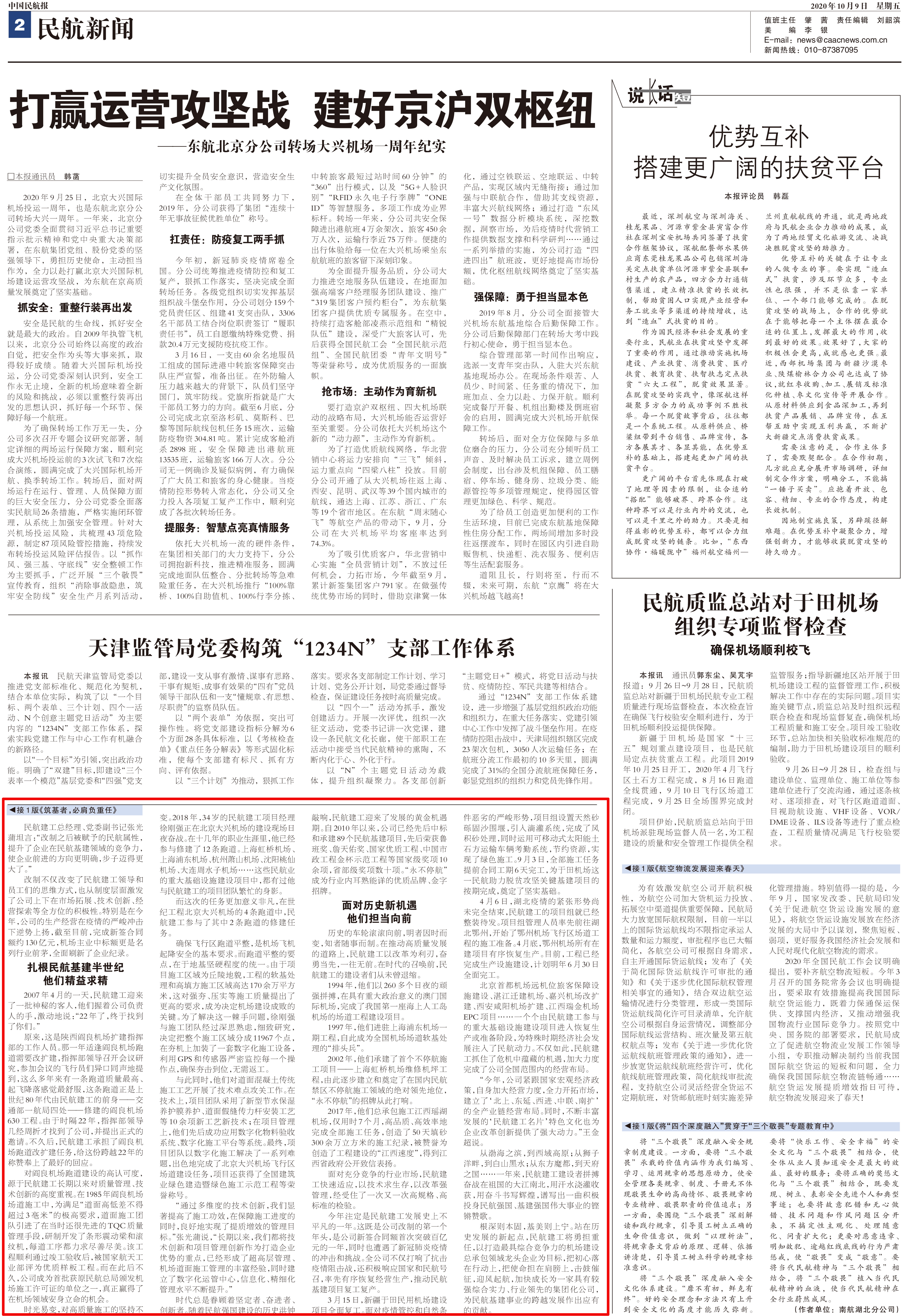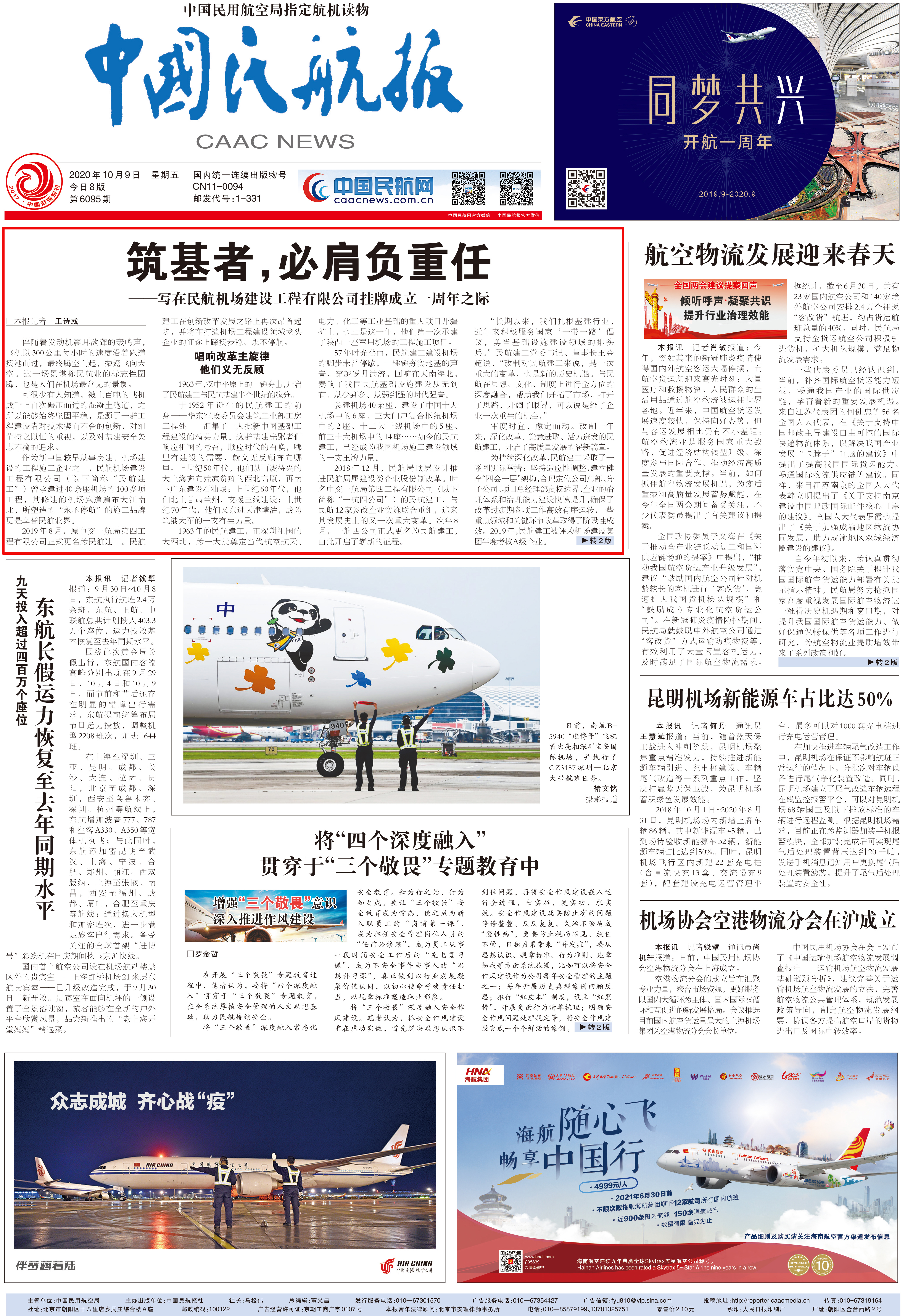 10月9日,《中國民航報(bào)》第6095期刊發(fā)頭版頭條文章,以《筑基者,必肩負(fù)重任——寫在民航機(jī)場建設(shè)工程有限公司掛牌成立一周年之際》為題,對公司改革發(fā)展歷程及取得的成就業(yè)績等內(nèi)容進(jìn)行深度報(bào)道。