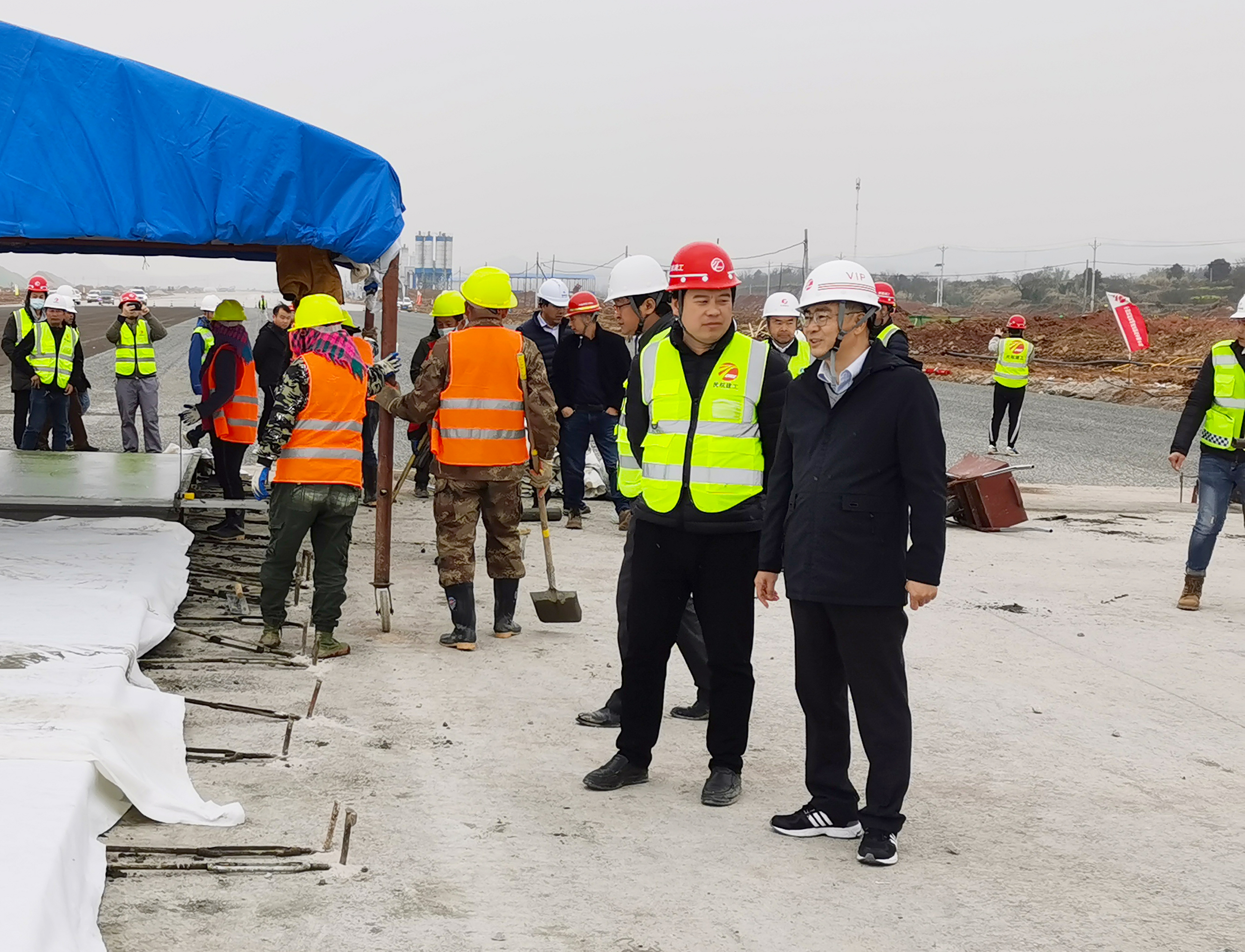 鄭永強(qiáng)一行深入項(xiàng)目一線,實(shí)地查看現(xiàn)場(chǎng)施工進(jìn)度、質(zhì)量及安全管理等情況,對(duì)滑行道水穩(wěn)、跑道北防吹坪混凝土施工開(kāi)展專項(xiàng)檢查,并對(duì)項(xiàng)目相關(guān)工作給予肯定。鄭永強(qiáng)強(qiáng)調(diào),項(xiàng)目要統(tǒng)籌安排施工計(jì)劃,合理安排施工資源,確??傮w施工進(jìn)度節(jié)點(diǎn);后續(xù)施工中要加強(qiáng)道面水穩(wěn)、混凝土實(shí)體質(zhì)量驗(yàn)收指標(biāo)控制;強(qiáng)化臨邊防護(hù)、臨時(shí)用電安全管控,優(yōu)質(zhì)高效安全完成工程建設(shè)任務(wù)。