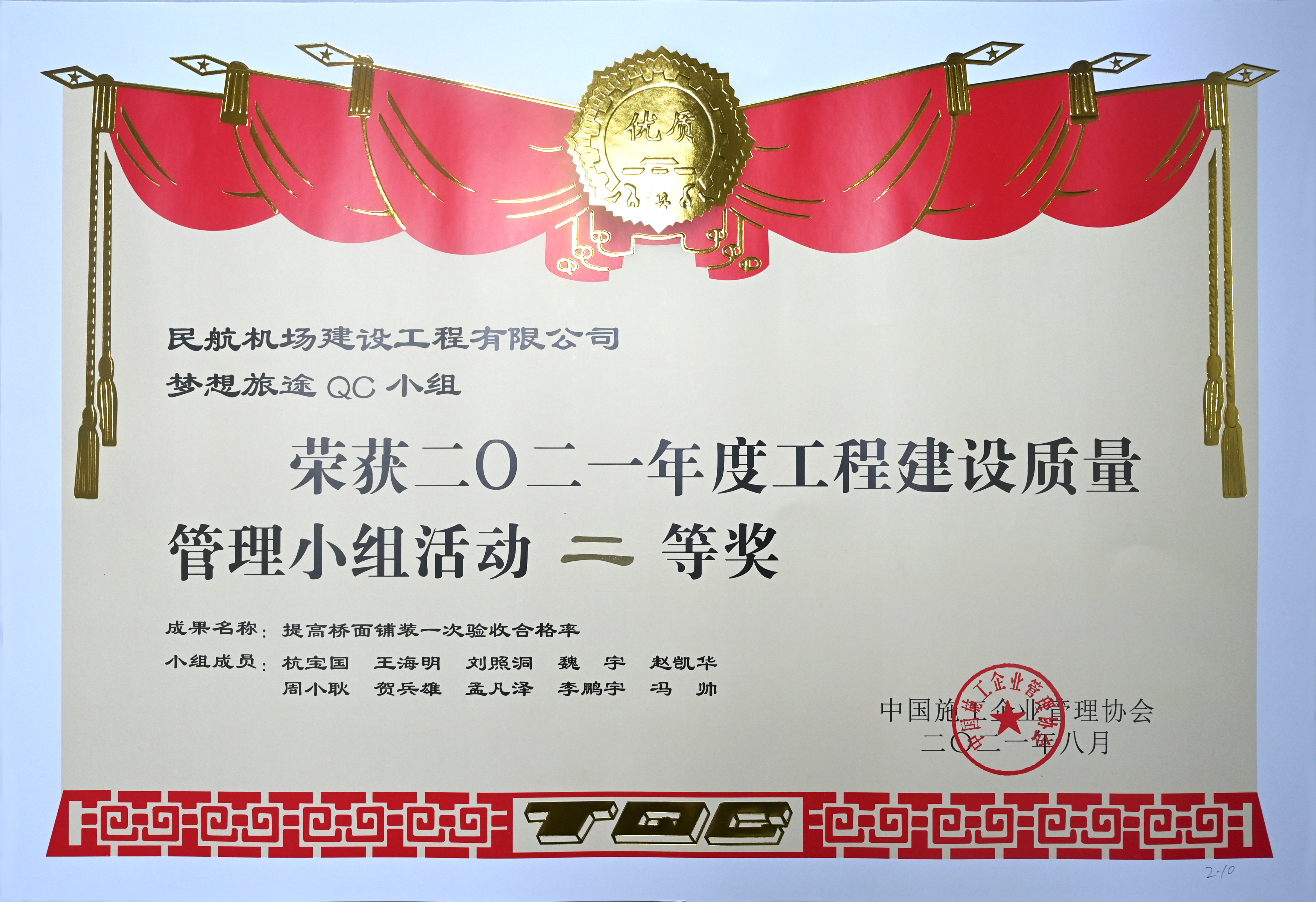 8月19日,中國施工企業(yè)管理協(xié)會2021年度全國工程建設(shè)質(zhì)量管理小組競賽活動結(jié)果公布,公司“夢想旅途”QC小組的參賽成果《提高橋面鋪裝一次驗收合格率》榮獲2021年度全國工程建設(shè)質(zhì)量管理小組活動二等獎。