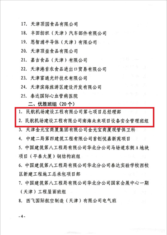 近日,由天津市濱海新區(qū)總工會(huì)、濱海新區(qū)經(jīng)濟(jì)管理局、濱海新區(qū)衛(wèi)生健康委員會(huì)聯(lián)合開展的2019-2020年度天津市濱海新區(qū)“安康杯”競賽落下帷幕,公司第五總經(jīng)理部南海未來城項(xiàng)目設(shè)備安全管理班組和第七總經(jīng)理部分獲2019-2020年度天津市濱海新區(qū)“安康杯”競賽優(yōu)勝班組榮譽(yù)稱號(hào)。